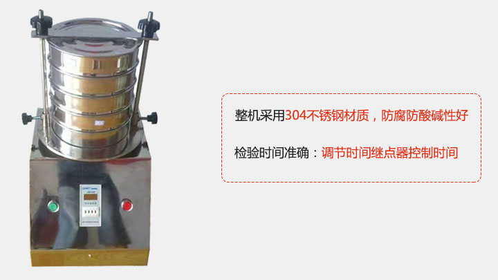 3,檢驗篩整機采用304不銹鋼材料,該材質(zhì)針對于腐蝕酸堿物料的篩分并能保證其使用壽命。